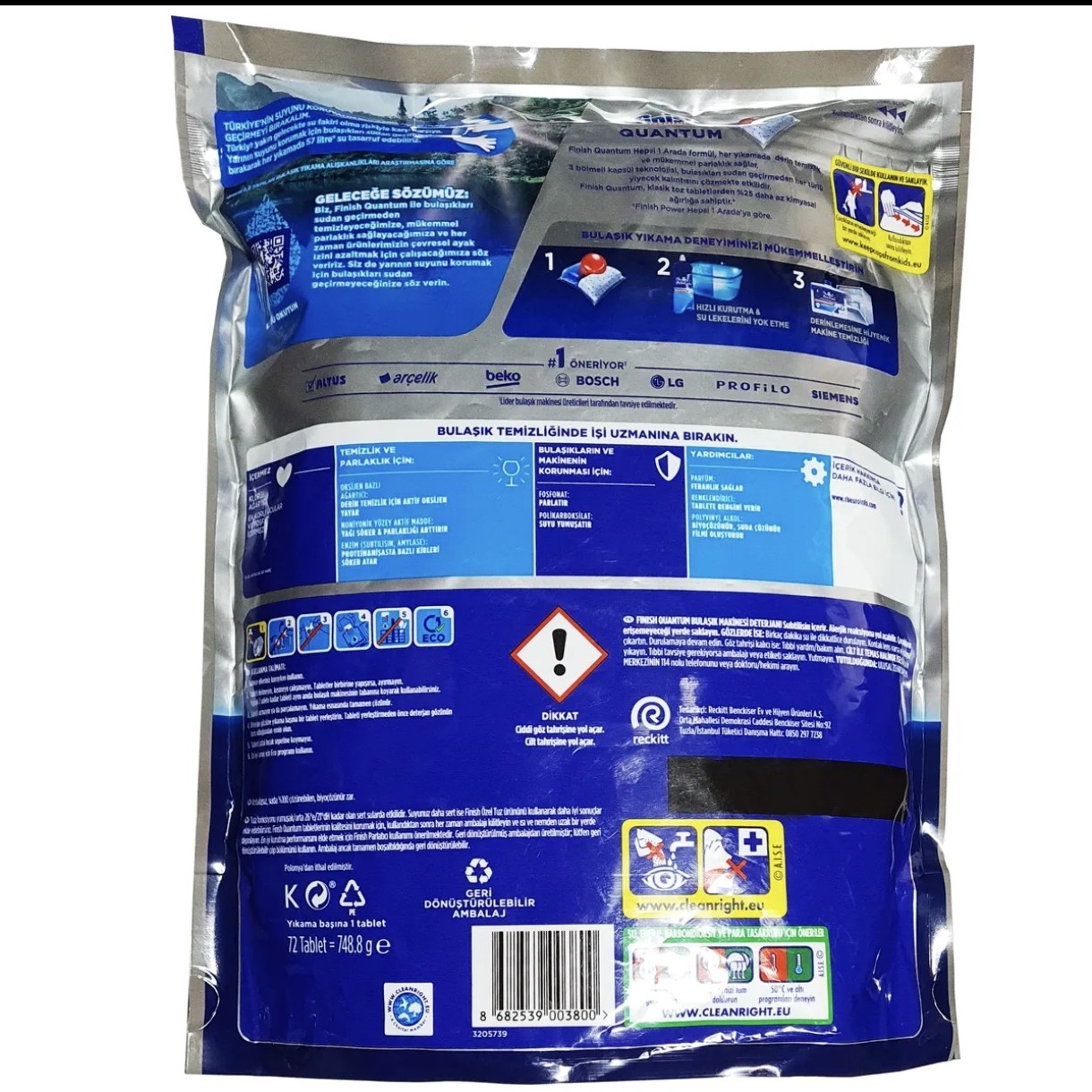 قرص فینیش کوانتوم حاوی ماده شوینده و نمک مخصوص ظرفشویی و مایع جلادهنده بوده و با قدرت بالای شستشو و لکه بری بسیار قوی و درخشندگی ظروف مناسب برای همه برندهای ماشین ظرف شویی